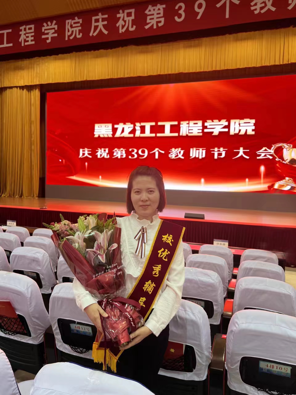 为庆祝第39个教师节,9月8日14时,黑龙江工程学院在逸夫图书馆报告厅隆重举行庆祝第39个教师节大会,表彰在工作中作出突出贡献的先进集体和个人,我院唐艳杰老师被评为“黑龙江工程学院2023年度优秀辅导员”。