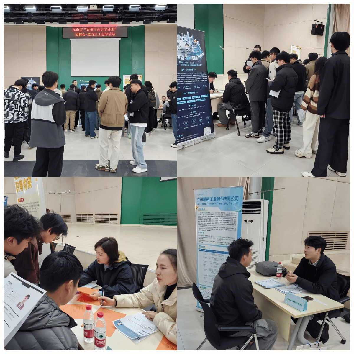 宣讲结束后,主楼B区报告厅专场招聘会正式启动。立讯精密、丘钛微电子、科瑞恩科技、沪士电子、定颖电子、长鹰硬质材料、腾飞科技等7家昆山优质企业集中亮相,设立专属招聘展位,推出非标自动化工程师、设备技术员、机械/电气工程师、研发管培生、工艺工程师、储备干部等一系列优质岗位,覆盖本科、硕士多个学历层次,精准契合我校学科专业特色。岗位薪资待遇优厚,其中部分研发类岗位年薪可达15-25万元,各企业均提供五险一金、免费食宿、带薪年假、技能培训、职称评定等完善的福利保障,为毕业生搭建稳定、广阔的职业发展平台。