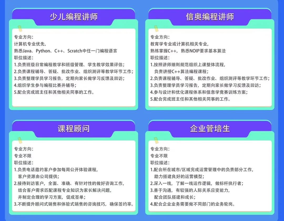 1、计算机专业优先,熟悉Java、Python、C++,Scratch中任一门编程语言;