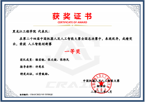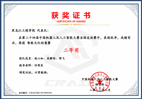 2022年7月27日,第24届中国机器人及人工智能大赛全国总决赛在宁波大学科学技术学院开幕。此次大赛共有来自北京大学、复旦大学、哈尔滨工业大学等全国870多所高校、近1万2千支队伍报名参赛,其中504所高校1788支队伍进入全国总决赛。我院由骆宏锐、张文俊、张炜民、赵心如、吴静怡、周飞、段鹏辉、张鑫、刘冰洁等人组成的4支代表队参加了比赛。其中骆宏锐、张文俊、张炜民的“基于生成式对抗网络的儿童绘画智能辅助教学系统”获得全国一等奖,赵心如、吴静怡、周飞的“基于深度学习的儿童辅助汉字教学系统”获得全国二等奖。
