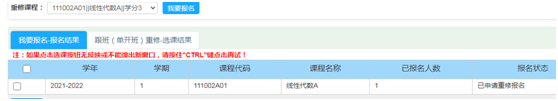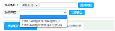 3. 在【重修课程】的下拉菜单中选择需重修课程,点击右侧下方的【我要报名】键,成功报名的课程将显示在页面上,依次操作,确认下拉菜单中所有课程均报名成功后,退出系统。