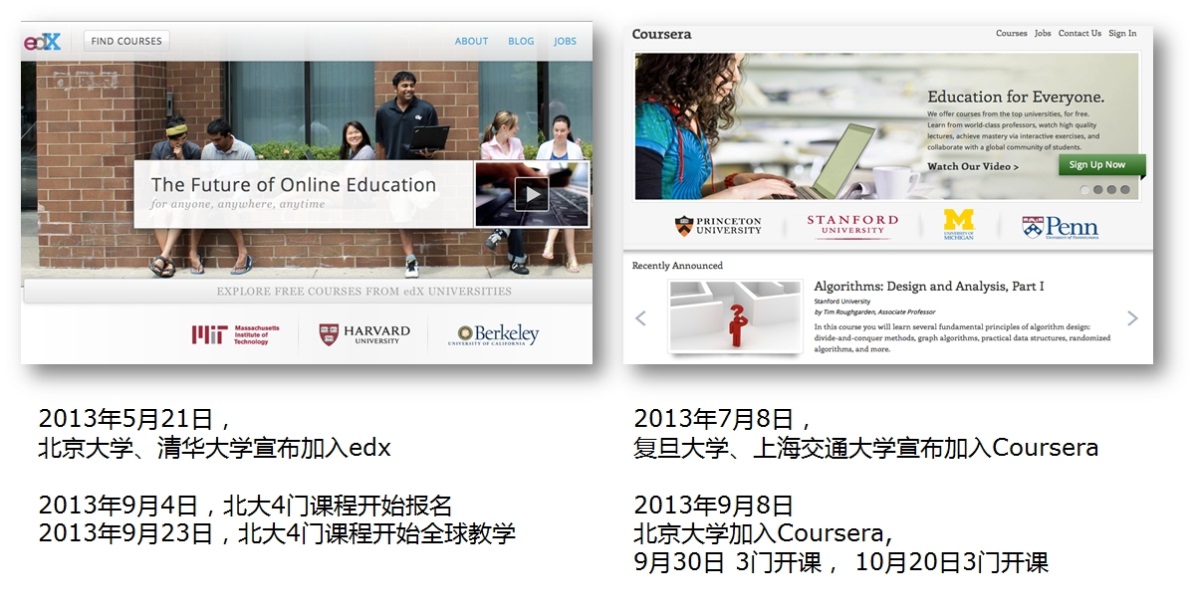 这一大规模在线课程掀起的风暴始于2011年秋天,被誉为“印刷术发明以来教育最大的革新”,呈现“未来教育”的曙光。2012年,被《纽约时报》称为“慕课元年”。多家专门提供慕课平台的供应商纷起竞争,Coursera、edX和Udacity是其中最有影响力的“三巨头”。