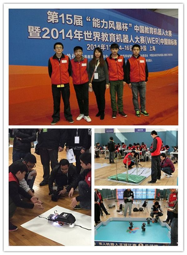 2014年11月14日至16日,机电工程学院“能动量”机器人创新团队在齐建家、刘财勇两位老师的带领下,参加了由中国人工智能学会智能机器人专业委员会、中国自动化学会机器人竞赛工作委员会主办,国际类人机器人比赛中国赛区组委会协办,上海工程技术大学承办的“第十五届‘能力风暴杯’中国教育机器人大赛暨2014年世界教育机器人大赛(WER)中国锦标赛”。本次比赛中,我校机电工程学院“能动量”机器人创新团队的师生参加了机器人创新赛、类人机器人全能挑战赛和类人机器人足球赛三个比赛项目。经过紧张、激烈的角逐,最终获得机器人创新赛一等奖,类人机器人全能挑战赛二等奖,类人机器人足球赛三等奖等3个奖项的好成绩。在比赛过程中,专家评委对我们的“蚂蚁觅食”仿生机器人给予了高度评价。