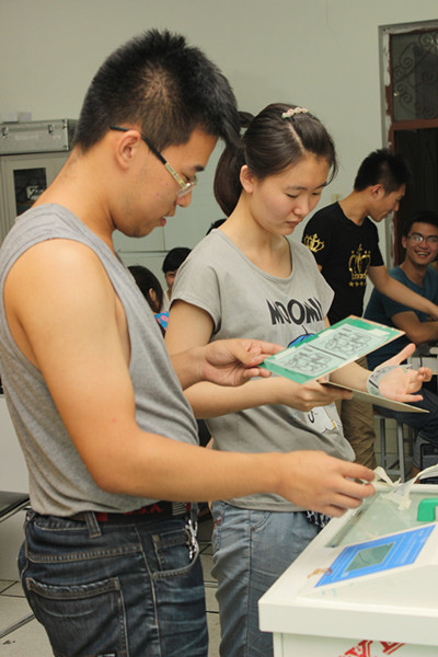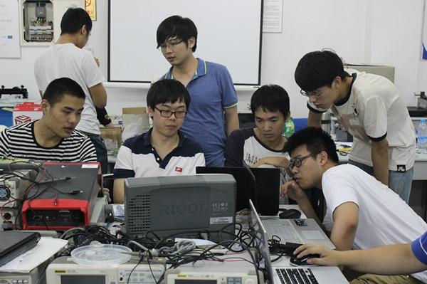 2014年暑假期间,我校大学生电子创新实践基地再次开展了大学生电子设计竞赛活动——对经过考试选拔的队员进行集中培训,历时1个月。参加此次电子竞赛赛前培训的队伍49支,共147人,为我校历年参加此项活动人数最多的一年。在学校、教务处及电气与信息工程学院的大力支持下,在指导教师的带领下,各个年级传帮带式的开展各个水平和能力级别的训练和调试,大的项目嵌套小的项目,从单元功能电路,到电子系统级设计,师生乐此不疲,尽享电子技术的深邃魅力,队员的创新实践能力和合作能力稳步增强。