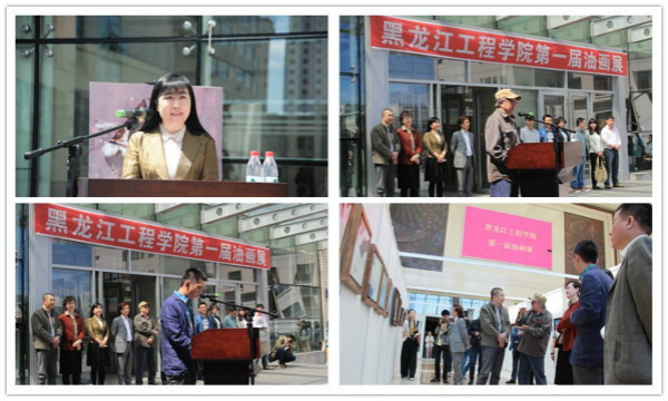 董莉副校长在开幕式上致辞,石铁民主任和黑龙江工程学院艺术学院油画中心主任姚刚发表了讲话。开幕式结束后,与会代表参观了画展。油画作品在逸夫图书馆展出时间为:5月28日——6月3日。