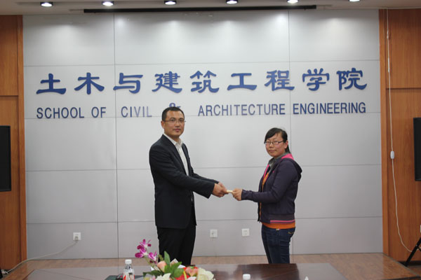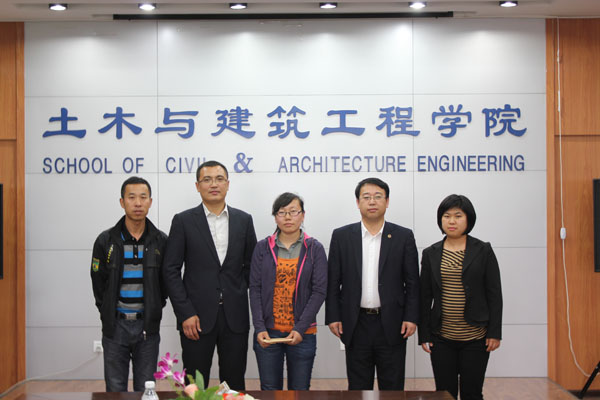 感恩母校培养,情系困难学生,我校土木与建筑工程学院校友——龙顺建筑工程公司董事长李书奇先生爱心捐赠苏玉双同学资助仪式于2013年5月10日下午在土木楼418举行。