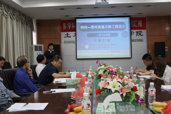 汇报会上,毕业设计大课题组的六个小组,即:道路设计、桥梁设计、隧道设计、高速公路大型服务区建筑设计、结构设计、暖通设计等六专业方向,分别就“鹤岗--黑河高速公路二所至长青段(含大型服务区)”工程的阶段性设计成果进行了汇报。与会专家认真听取汇报后,对学生们的设计思路和阶段性成果给予了充分肯定。对学生在设计过程中能体现出的专业协作精神,团队合作意识给予了高度赞扬。专家一致认为,该毕业设计形式符合现代工程多学科、多专业、综合性的特点,是毕业生在校期间难得的一次学习机会。同时,与会专家结合自身的工程实践经验,为修改和完善设计成果给出了中肯的意见和建议。