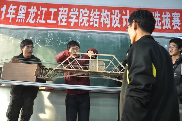 从得知省里要举办结构设计大赛的那一时刻起,土木与建筑工程学院的同学们就积极的准备起来。同学们创建自己的团队,坐到一起提出自己的想法,寻找用于结构的材料,将团队的想法付诸实施。同时,还积极地与指导老师沟通,询问有关比赛的规则以及比赛的流程。学院中几位从事结构方面教学的老师利用课余时间对学生在设计过程中遇到的一些问题进行耐心细致的指导,把他们的经验传授给每一位参赛的同学。