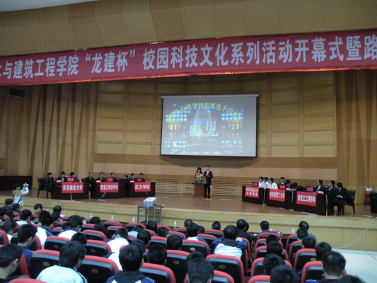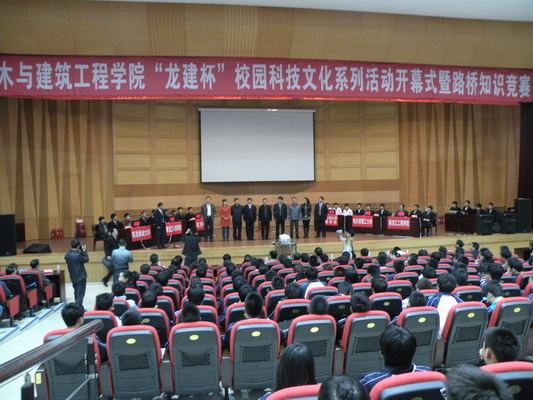 2011年5月6日下午1:30分,土木与建筑工程学院首届“龙建杯”校园科技(工程)文化系列活动开幕式暨路桥专业知识竞赛在逸夫报告厅隆重开幕。学校党委副书记杨宏宇,副校长张洪田,校长助理、招生就业处处长王敏,校长助理、党委(校长)办公室主任孟海帆以及部分处室领导参加了开幕式。本次活动的主办方之一龙建路桥股份有限公司副总经理总工程师陈超先生、龙建路桥股份有限公司办公室主任孙向东先生出席了开幕式。东北林业大学、哈尔滨理工大学、黑龙江科技学院、东方学院、东北石油大学华瑞学院等省内五所高校有关领导率队参加了开幕式。