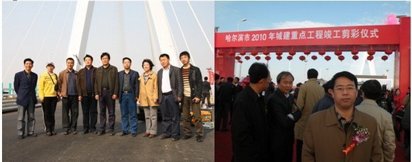 据哈尔滨市建委负责人介绍,松浦大桥的建设,从引桥桩基础建设,到水下桩基础的浇注,再到江中主塔建设,都采用了先进的施工技术。其中,非对称斜拉技术、自平衡法工程桩承载力检测技术、大口径大承载力桩基极限承载力静载试验技术、大孔径变截面超长桩技术、160米高钻石形塔柱的爬模施工技术、高寒地区大跨度钢砼叠合梁技术等都是在高寒地区首次应用。此次参观学习,让教师们深切地感受到,要成为一名真正的“双师型”教师,需要不断地实践。10月13日,土木与建筑工程学院院长武鹤应邀参加松浦大桥竣工通车剪彩仪式。
