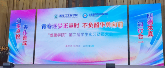 6月6日下午,由学校和龙建路桥股份有限公司联合组织的“青春逐梦正当时 不负韶华勇向前”——“龙建学院”第二届学生实习动员大会在华旗礼堂V3厅隆重召开,党委副书记、校长刘志强,党委副书记、工会主席刘建弛及教务处、产教融合处、土木与建筑工程学院相关领导、老师,龙建股份党委书记、董事长田玉龙,党委副书记、副董事长、总经理宁长远等公司领导以及权属单位相关人员出席会议。学校2020级和2021级“龙建班”共120名学生参加动员大会。