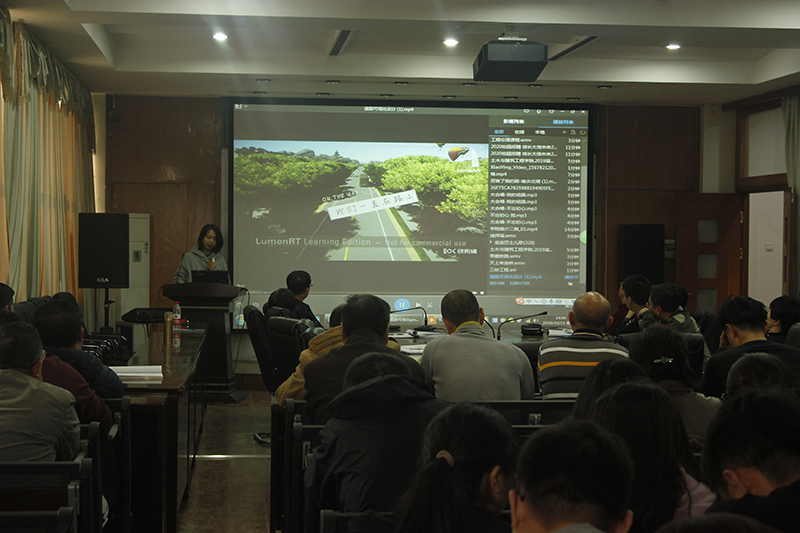 刘老师的讲授主要包括软件介绍和道路可视化设计流程两部分内容。PowerCivil for China软件是Bentley 土木交通行业基于最新的OpenRoads 技术开发的核心BIM软件InRoads的中文版,是面向道路、铁路、桥涵、场地等基础设施设计的,可为土木工程和交通运输基础设施项目的整个生命周期提供支持。她以道路毕业设计资料某个地形图为例,介绍了利用PowerCivil进行道路可视化设计的流程及界面操作方法和技巧。流程包括设计准备、路线平面设计、路线纵断面设计、创建横断面模板、创建走廊带、交通设施设计、地模修剪、出图出表和3D漫游/LumenRT渲染。给大家展示了完成渲染后的道路可视化设计成果。