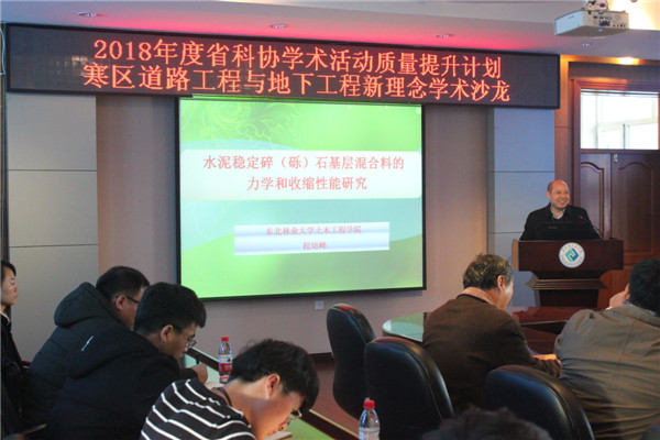 2018年11月16日下午,由黑龙江工程学院科协、土木与建筑工程学院共同主办的2018年度省科协学术活动质量提升计划项目“寒区道路工程与地下工程新理念学术沙龙”在A801会议室隆重召开。出席本次学术沙龙的嘉宾和专家有哈尔滨工业大学交通学院院长、长江学者谭忆秋,东北林业大学土木工程学院院长程培峰,中国科学院西北生态环境与资源研究院冻土工程国家重点实验室主任李国玉,黑龙江省交通科学研究所副所长王兴隆,黑龙江省水利科学研究院寒区工程研究所副所长李兆宇,黑龙江大学建筑工程学院丁琳教授等来自黑龙江大学、东北农业大学、黑龙江科技大学、黑龙江工程学院的部分学生和专业教师代表出席了本次学术沙龙。沙龙分别由土木与建筑工程学院院长武鹤教授和黑龙江大学建筑工程学院丁琳教授主持。