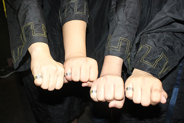 辅导员李阔老师主持了受戒仪式。他首先介绍了工程师之戒的由来:工程师之戒起源于加拿大的魁北克大桥悲剧,这起悲剧是由工程师在设计中一个小的计算失误造成的。惨痛的教训引起了人们的沉思,于是自那时起,垮塌桥梁的钢筋便被重铸为一枚枚戒指,并举行工程师召唤仪式(The Ritual of the Calling of an Engineer)。仪式中,工程学院教授,或者资深工程师,将为工程学院毕业生佩戴工程师之戒;学生将进行工程师宣誓(Engineers Commitment),表明愿意承担工程师的无尚责任,心怀对工程师职业的敬畏之心。