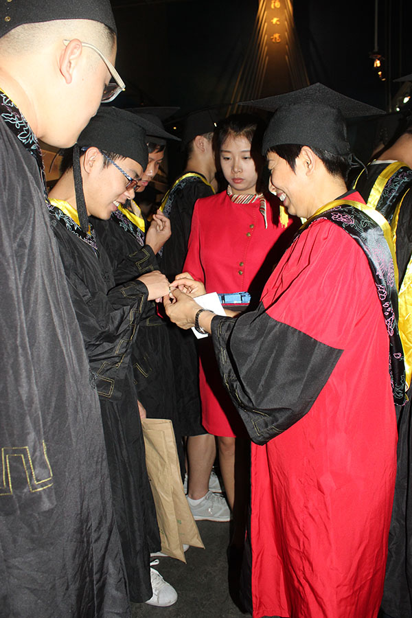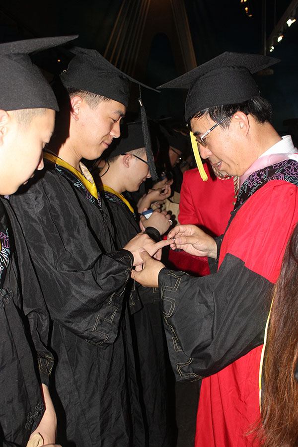 第二个环节是毕业生身着学士服,在聚光灯的照射下,由学院教授逐一为毕业生们佩戴“工程师之戒”,此仪式让学生感受到在未来的岗位上所肩负的社会责任,要时刻把公众安全,系于首位。接下来,受戒的毕业生庄严举起受戒之手跟随李阔老师诵读誓词。铿锵有力、慷慨激昂的誓词激荡着每一名毕业生的心灵,这誓词是一种警示,一种告诫,一种承诺,更是一种激励,一份契约。它警示和告诫着“工程人”应当坚守的道德底线和职业操守,激励着“工程人”应当甘于奉献,永做栋梁的信念与追求,同时这誓词也誓出了工程人“以人为本,工程至上;社会责任,勇于担当”的庄严承诺。