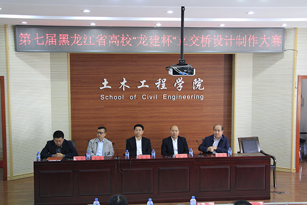 2017年9月20日第七届黑龙江省高校“龙建杯”立交桥设计制作大赛在东北林业大学土木工程学院顺利召开。本届大赛与会嘉宾有龙建路桥股份有限公司副总经理、总工程师陈彦君、黑龙江省公路学会副理事长肖生智、龙建杯系列大赛组委会负责人、黑龙江工程学院土木与建筑工程学院院长武鹤、东北林业大学土木工程学院院长程培峰和副院长王立峰。竞赛评委有来自哈尔滨工程大学的薛启超老师、黑龙江工程学院的盛可鉴老师、哈尔滨理工大学的李振国老师、黑龙江科技大学的许姗姗老师、东北林业大学的郝向伟老师。大赛开幕式由东北林业大学土木工程学院副院长王立峰教授主持。