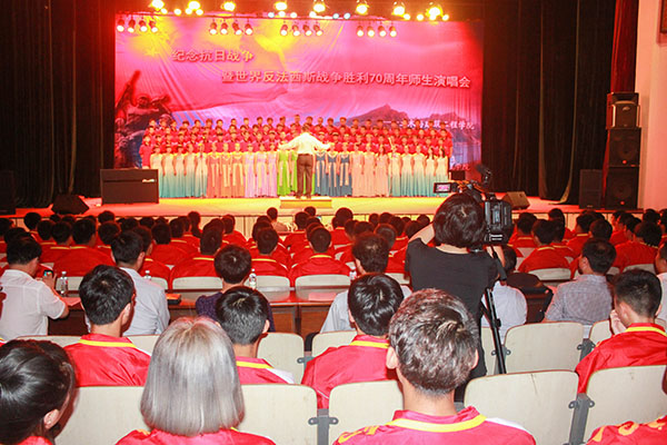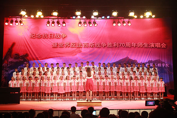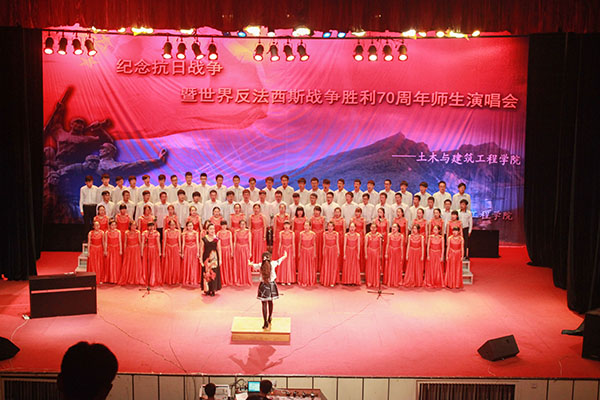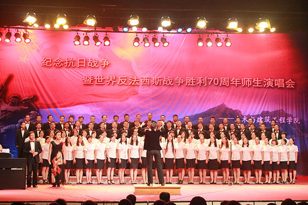 “铭记抗战史,激发爱国情,凝聚民族魂,共筑中国梦”。为纪念中国人民抗日战争暨世界反法西斯战争胜利70周年,2015年8月31日晚六时,土木与建筑工程学院在大学生活动中心隆重举行了师生演唱会。校党委书记李青、党委副书记白玉、党委(校长)办公室主任孟海帆、宣传部长郝丽红、学工部长德国明、团委书记王大春、思想政治教研部书记戴明清等校领导和部门领导以及各院系相关负责人和教师代表作为嘉宾莅临了演出现场。