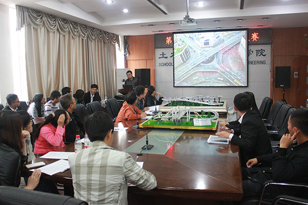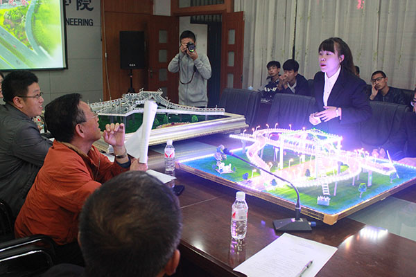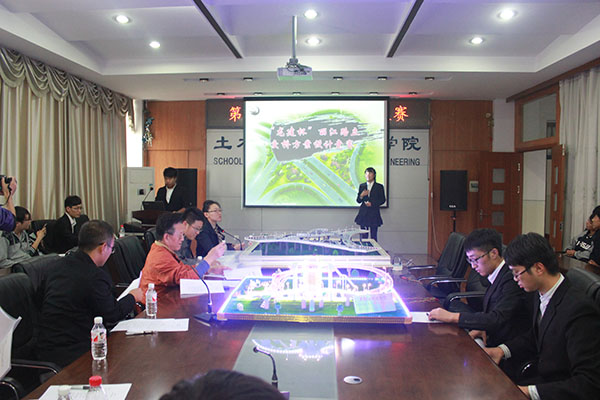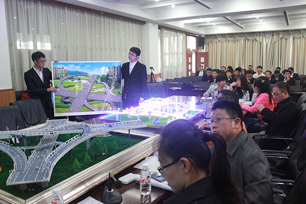 本次比赛备选方案分别是学府路与中兴大道十字交叉处立交桥设计方案以及丽江路与城乡路十字交叉处立交桥设计。设计的主旨是解决两个方案路段的平面交通流拥堵问题,并且对周边拥堵交通流的影响考虑越详尽越好。各代表队按抽签顺序依次登场介绍自己的作品,包括设计理念、制作过程、设计原则和方案对比等。在精美的PPT和参赛人员的详细介绍下,一件件作品完整的呈现在观众和评委面前。