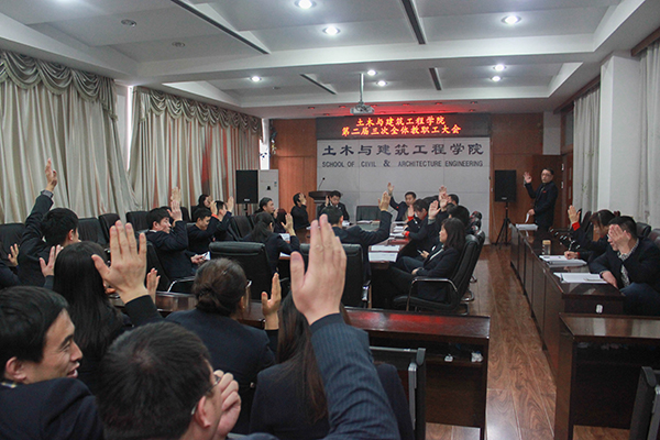 大会号召,全院广大教职工在学院党政班子的领导下,肩负起学院发展的神圣使命,进一步发挥教职工在学院建设和发展中的主力军作用,开拓进取、勇于担当,为把土木与建筑工程学院建设成为内涵充实,特色鲜明,充满活力的高水平一流学院而努力奋斗!
