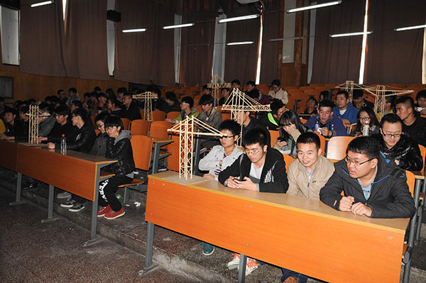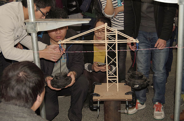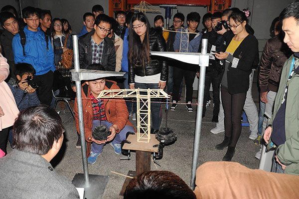 结构设计大赛的宗旨是培养大学生的创新意识、合作精神,提高大学生的创新设计能力、动手实践能力和综合素质,加强高校间的交流与合作。本次竞赛的要求是设计并制作一个塔吊模型,包括塔架、起重臂、平衡臂等构件。共有来自土木、机电、材料三个学院的60支队伍,近300人参赛,是我校历届结构设计竞赛规模最大的一次。学生们的作品设计大胆、构思巧妙,让观众大开眼界。