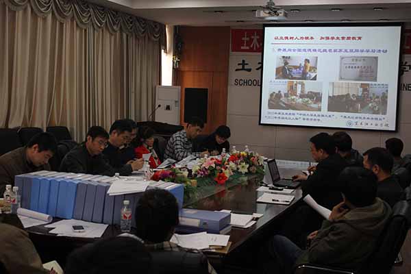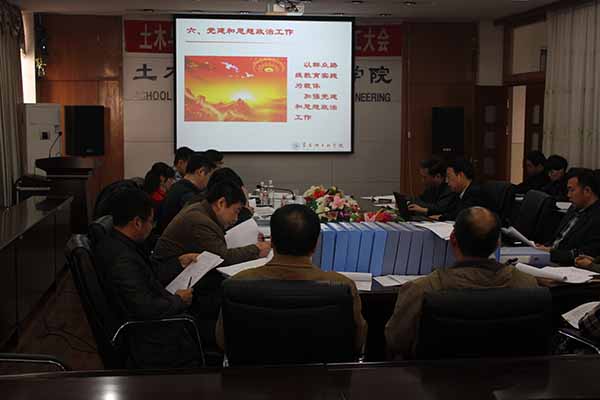 组织部部长王举鹏就开展检查的目的、意义进行了简要介绍,并对本次检查工作进行了分工。院长武鹤代表土木学院领导班子,围绕建设内涵充实、特色鲜明的高水平二级院系目标,就土木学院2013年重点工作及党风廉政建设完成情况,从教学、科研、产学合作、队伍建设、学生管理和就业、党建和思政工作、党风廉政建设七部分进行了汇报。武院长归纳总结了学院2013年取得的主要成绩和阶段性成果,同时也指出了学院在建设发展中存在的主要问题及改进措施。