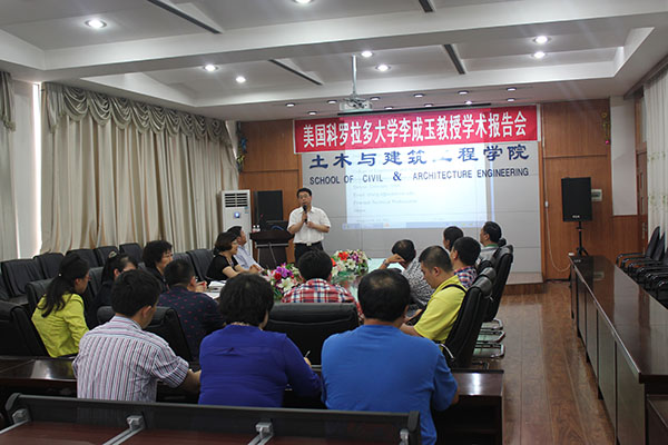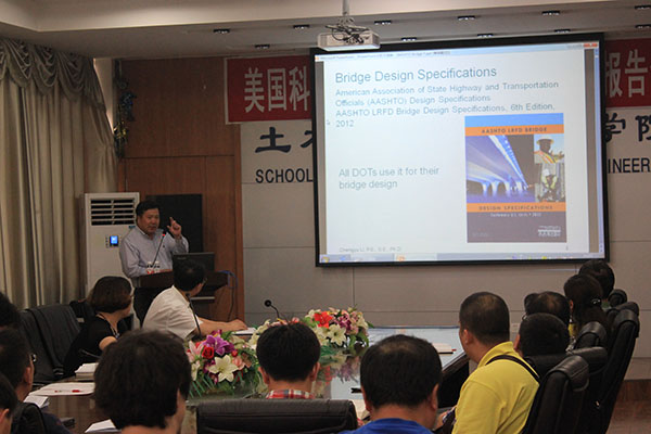 2014年6月10日下午2点30分,土木与建筑工程学院在土木工程楼418报告厅举办了第十八期“土木工程师论坛”, 邀请了美国科罗拉多大学工程与应用科学学院副院长,美国大型桥梁设计咨询公司Atkins公司桥梁技术总监,美国注册职业工程师、注册结构工程师,博士,李成玉(Chengyu Li)教授作了关于”美国桥梁设计方法”的学术报告。报告会由院长武鹤教授主持,道桥系教师和土木工程(道桥)专业卓越班的同学参加了本次报告会。