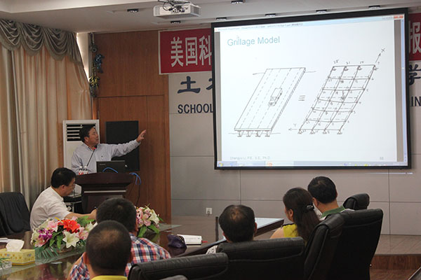 作为美国混凝土协会会员、美国土木工程协会会员、美国钢结构协会会员、美国结构工程协会会员,李成玉教授二十多年来一直从事各种桥梁体系的研发、咨询、设计工作。本次讲座李教授以美国桥梁设计规范AASHTO为依据,基于可靠度设计理论,全面介绍了美国现行的桥梁结构设计方法,分别就桥梁设计中的荷载组合、疲劳设计理论、极限设计状态和强度组合等内容进行了分析。同时,针对桥梁分析方法、预制桥面板结构设计、桁架法钢筋混凝土设计理论等方面进行了全面的讲解,并介绍了美国相关桥梁的计算实例,让我们看到了国内桥梁领域与国外先进技术的差别,李教授为与会师生提供了前沿的设计知识,开阔了师生的专业视野。