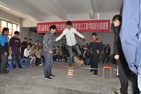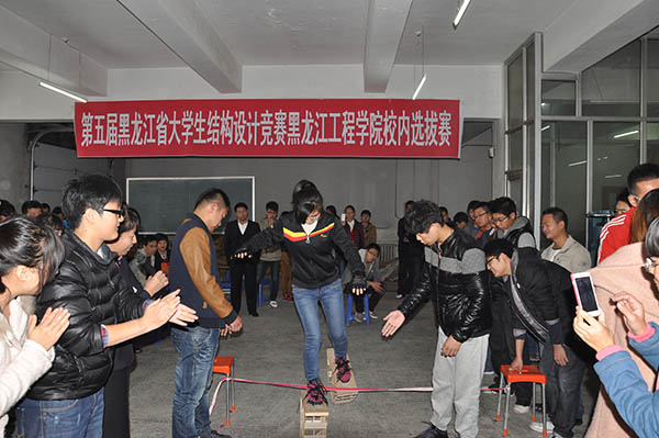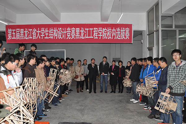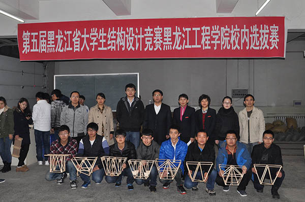 由黑龙江省力学学会主办,哈尔滨工程大学承办的“2013年黑龙江省第五届大学生结构设计竞赛”将于今年十一月举行。为培养我校大学生的创新能力、实践能力和团结协作精神,发现拔尖人才,打造团队精神,激发创新意识,展示我校学生风采,2013年10月26日,由黑龙江工程学院教务处主办、土木与建筑工程学院承办的“2013年黑龙江省第五届大学生结构设计竞赛黑龙江工程学院选拔赛”在土木与建筑工程学院结构试验大厅成功举行。