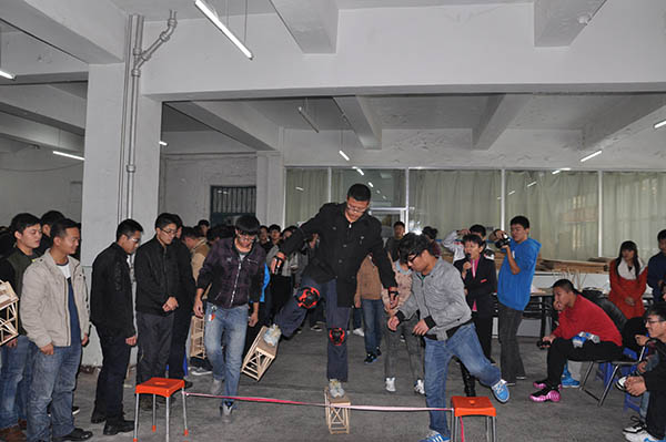 本次黑龙江省第五届大学生结构设计竞赛黑龙江工程学院选拔赛有来自土木与建筑工程学院道桥系、建工系以及机电工程学院的学生、共计29支队伍参赛。本次竞赛题目为“桐木条结构高跷模型静动载竞赛”,主要有静荷载加载和绕标竞速测试两个环节。参赛选手首先穿戴好护具及高跷模型站在地磅上称重,测量选手的总重量,并计算参赛作品的荷重比。紧接,参赛选手开始绕标测试,相关人员进行计时,所用时间越少者得分越高。从加载试验这一环节大部分参赛队伍的顺利进行不难看出各组参赛作品设计合理、性能良好,模型结构坚固、造型实用,体现出了选手们优良的竞技水准。绕标竞速测试中,既有人行动小心翼翼,步步扣人心弦;也有人身手矫健,健步如飞,令人惊叹。然而,也有比赛过程中不尽如人意的队伍,有的选手在跨过障碍物时,模型因受力不均而变形损坏,无论成功与否,他们都获得了评委老师的肯定和场下观众的阵阵掌声。