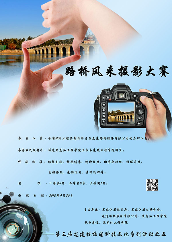 3、摄影作品必须为参赛者原创,不得在网络上下载。参赛者须拥有照片的著作权,并获得参赛照片中所包含人物肖像权的使用许可以及其它必要的许可。黑龙江工程学院拥有对作品宣传之用的使用权。
