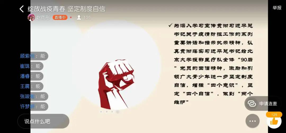 接着,开始了连线志愿者的环节,通过与志愿者同学的连线交谈,同学们更直观深入的了解了充满着艰辛危险的一线抗疫工作,更加深了对在疫情最前线工作者们的敬佩之情。
