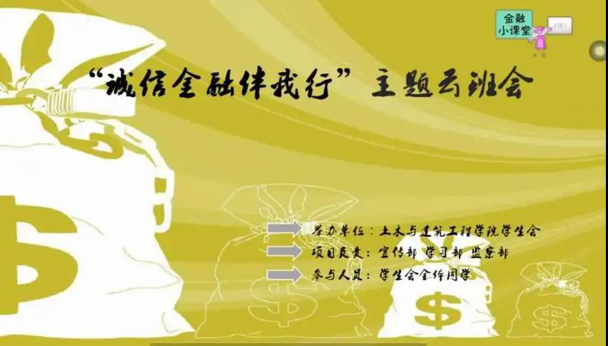 为了树立诚信意识,塑造诚信品质,弘扬诚信之风,响应学校的号召“诚信立身 全面发展”,遂于2020年06月17日下午15:00-16:30通过钉钉视频会议的形式开展以“诚信金融伴我行”为主题的班会活动。