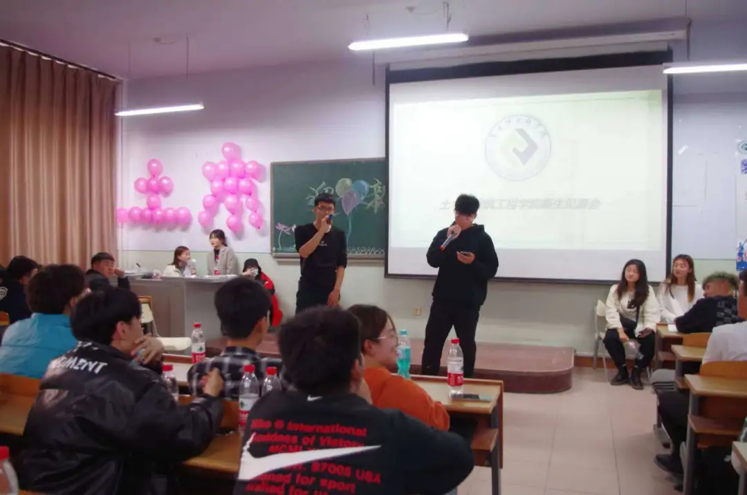 随后土木院学生会新生见面会正式开始,主持人由文艺部副部王崇旭担任,首先观看视频介绍了土木院学生会以及各部门的组成,学生会是现在学校中的组织结构之一,是学生自己的群众性组织,是学校联系学生的桥梁和纽带,是每个学校不可缺少的部门。它是提倡自我服务,自我管理,自我学习的学生组织,为学校学生和老师提供无偿服务的部门。引导同学努力做到身体好、学习好、工作好,德、智、体、美、劳全面发展,成为有社会主义觉悟的、有科学文化知识的、身体健康的人。同时大会第一项是为各位新生介绍学生会旗下十六个部门的组成与作用并展示了各个部门往年组织的特色活动,让大家认识到院学生会其他兄弟姐妹,为以后各部门相互协作,积极配合打下良好基础。
