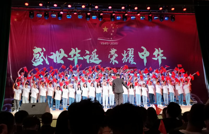 歌声接连不停,精彩继续上演。其他三只系部的演唱也悉数登场,由工程管理系大一新生带来的《我是一个兵》《走向复兴》,市政工程系大一新生带来的《强军战歌》《中国,鲜红的太阳永不落》都整齐划一、旋律激昂,用嘹亮的歌声唤起了中华儿女与祖国一起走向复兴,创造辉煌的自豪与向往。建筑规划系大一新生带来的曲目《在灿烂的阳光下》《光荣与梦想》,创意无限,集艺术性、专业性、参与性于一体,唱出了红色基因的不变情怀。由教师代表郭雷、李德海演唱的《红旗飘飘》将合唱活动推向了一个高潮,在激情澎湃的歌声中,全院师生喜迎祖国70华诞的热情被再一次点燃,全场观众挥动着手中的小红旗,台下一片红色的海洋。