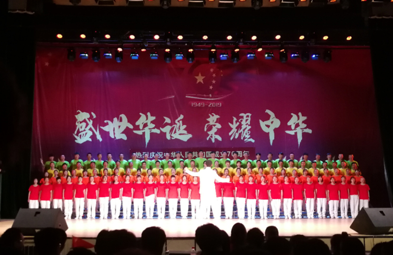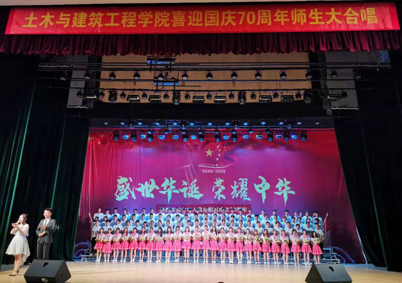 为隆重庆祝中华人民共和国成立70周年,歌唱伟大祖国,弘扬爱国主旋律,推动“不忘初心、牢记使命”主题教育开展,增强师生凝聚力,激发广大师生爱国情怀,9月27日下午,土木与建筑工院在大学生活动中心举办了“喜迎70国庆周年,不忘初心,牢记使命”红歌师生大型合唱活动,出席本次活动的有土木与建筑工程学院的院长武鹤、分党委书记郭树东、副书记王宇鹏、副院长王丽荣、房树田。土木与建筑工程学院全体师生参加了此次大合唱活动。