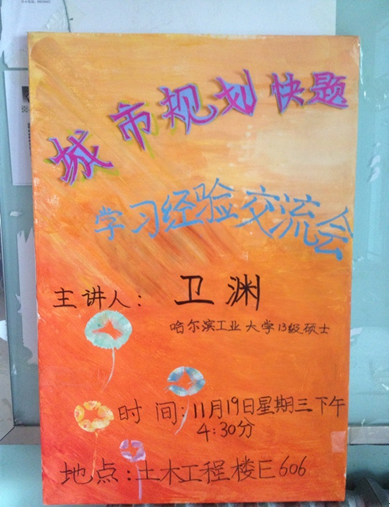 11月19日下午4:30,建筑系请来建筑系毕业生哈尔滨工业大学13级硕士卫渊在土木工程楼E606进行城市规划专业快题学习经验交流会。在交流会中,卫渊同学结合自己的自身经历向同学们介绍了手绘快题的重要性,并讲解了快题的相关技巧。此次交流会不仅仅对有考研意向的同学有很大的帮助,而且有助于提高同学们的专业素养,帮助学生更加顺利的实现考研、就业。