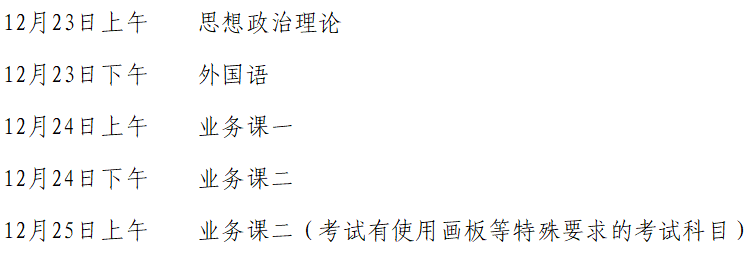 初试时间为2023年12月23日至24日(每天上午8:30—11:30,下午14:00—17:00)。考试有使用画板等特殊要求的考试科目在12月25日(上午8:30—11:30)进行。考试时间以北京时间为准。