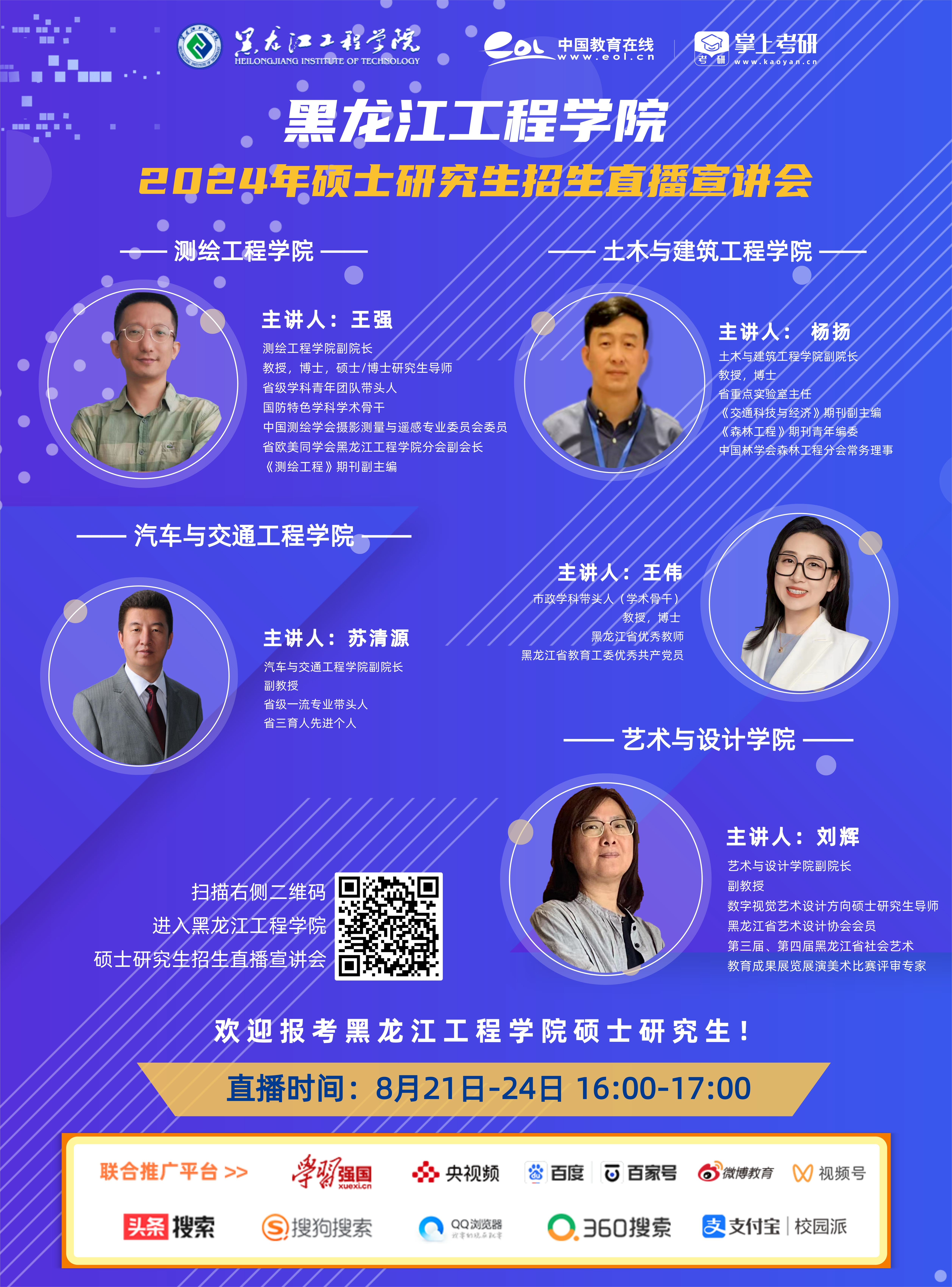 8月24日🔥 艺术与设计学院艺术与设计学院始于2001年,下设环境设计系、视觉传达设计系、产品设计系、工艺美术系、动画系和基础教研部6个专业系、部,同时依托产教融合机制,建设有17个专业工作室和美育教育中心、艺术设计与社会创新中心、黑龙江省漆画创作基地等多个教学、科研实践单位,2021年被黑龙江省文化和旅游厅授予“黑龙江省非物质文化传承教育基地”和“黑龙江省非物质文化传承研究基地”。目前,学院建有省级一流专业1个、校级一流专业2个;获国家艺术基金项目7项、中央地方共建项目1项;主持省部级及以上科研项目29项、开展横向课题研究22项;发表高水平学术论文147篇、出版专著11部、科研成果获奖53项、申请专利31项;指导学生完成国家级、省级创新创业项目200余项,全国、全省各类展览、竞赛获奖共计400余项。艺术与设计学院依托设计行业协会和学院教学科研创新平台,建设一支具有较高理论水平和丰富实践经验的专业教师队伍,现有硕士研究生导师15人,高水平行业导师11人。整体教学空间4000余平方米,配备有充足的图书资料,拥有作品展厅2间、硕士研究生导师工作站3个、个人工作室4个、团队工作室13个、创新中心1个,并与国内30余家企业签约合作。2022年,我校与省内知名企业合作成立“黑龙江工程创意设计研究院有限公司”,深耕产教融合共育研究生机制,构建适合艺术专业硕士特色的应用型人才培养平台。